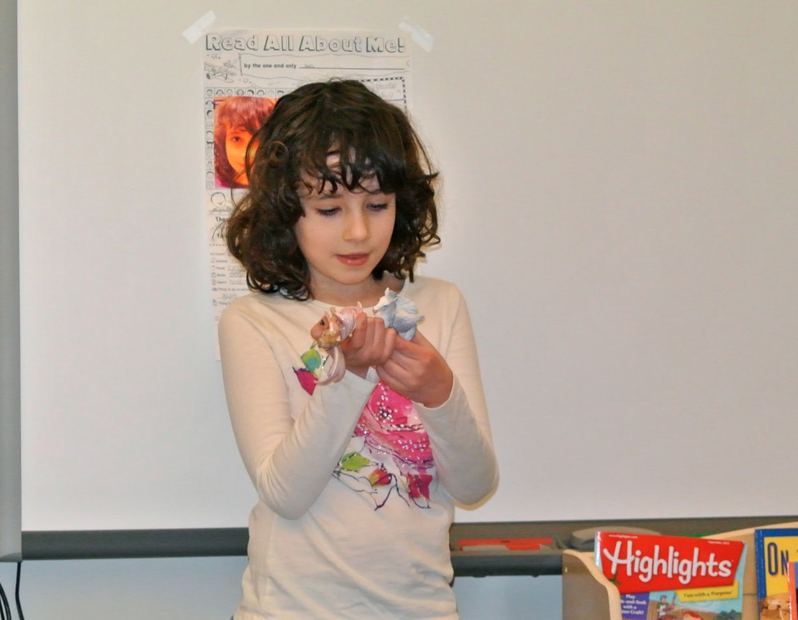 | Keira shared interesting facts about herself and told her classmates about her two favorite stuffies. One of the stuffies has been around before Keira was even born and she got the other after she hurt her eye. She also showed us her special fairy and pegasus figurines. Keira did a great job presenting today! |